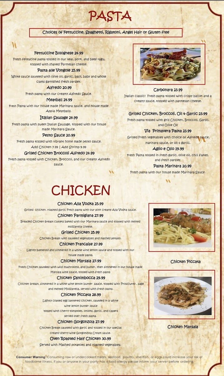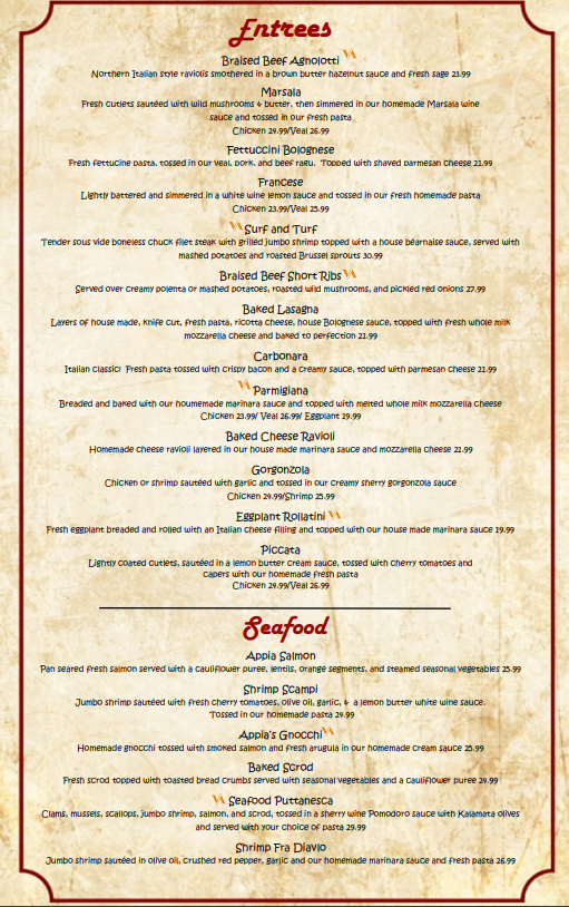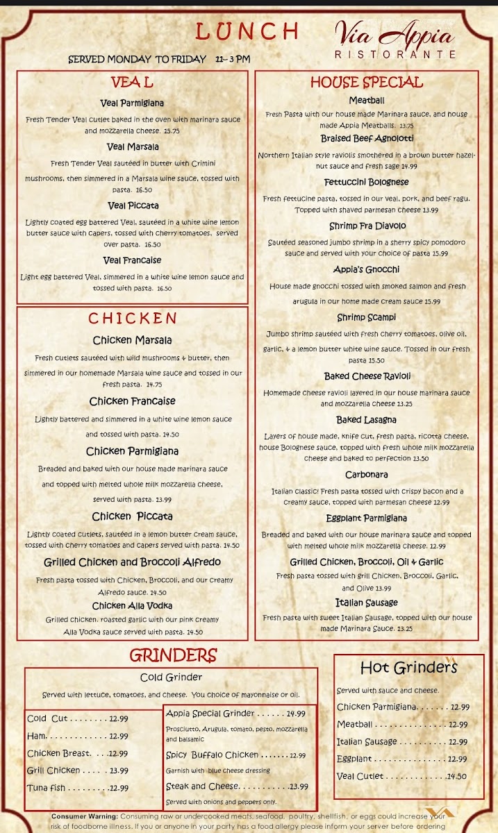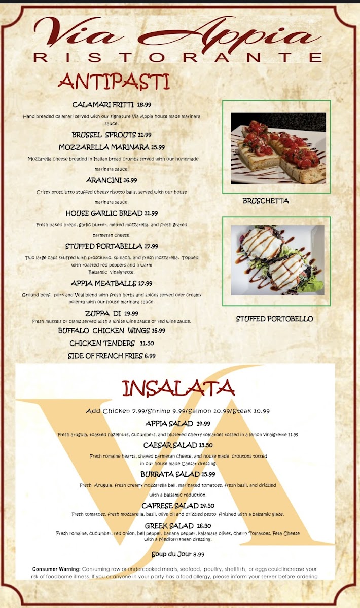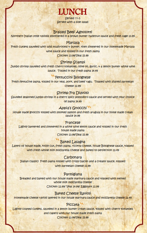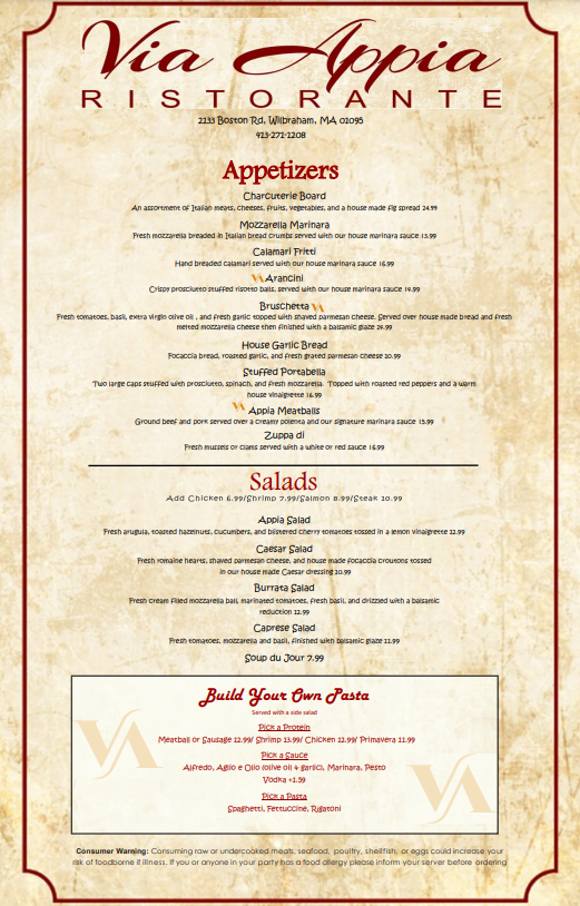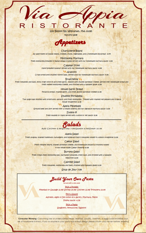 If you're in the mood for authentic Italian cuisine, look no further than Via Appia Ristorante Menu. Located at 2133 Boston Rd in Wilbraham, MA, this cozy spot offers a variety of classic Italian dishes that will transport your taste buds straight to Italy. From the rich, savory pastas to the perfectly cooked meats, each dish is crafted with the finest ingredients. Whether you're craving a comforting bowl of spaghetti or a delicate risotto, you'll find something to satisfy every appetite. The menu is a celebration of traditional flavors, with plenty of options for both meat lovers and vegetarians alike. Pair your meal with a selection from their carefully chosen wine list, and you're in for an unforgettable dining experience. Whether you're here for a casual lunch or a special evening out, Via Appia Ristorante will make you feel right at home.